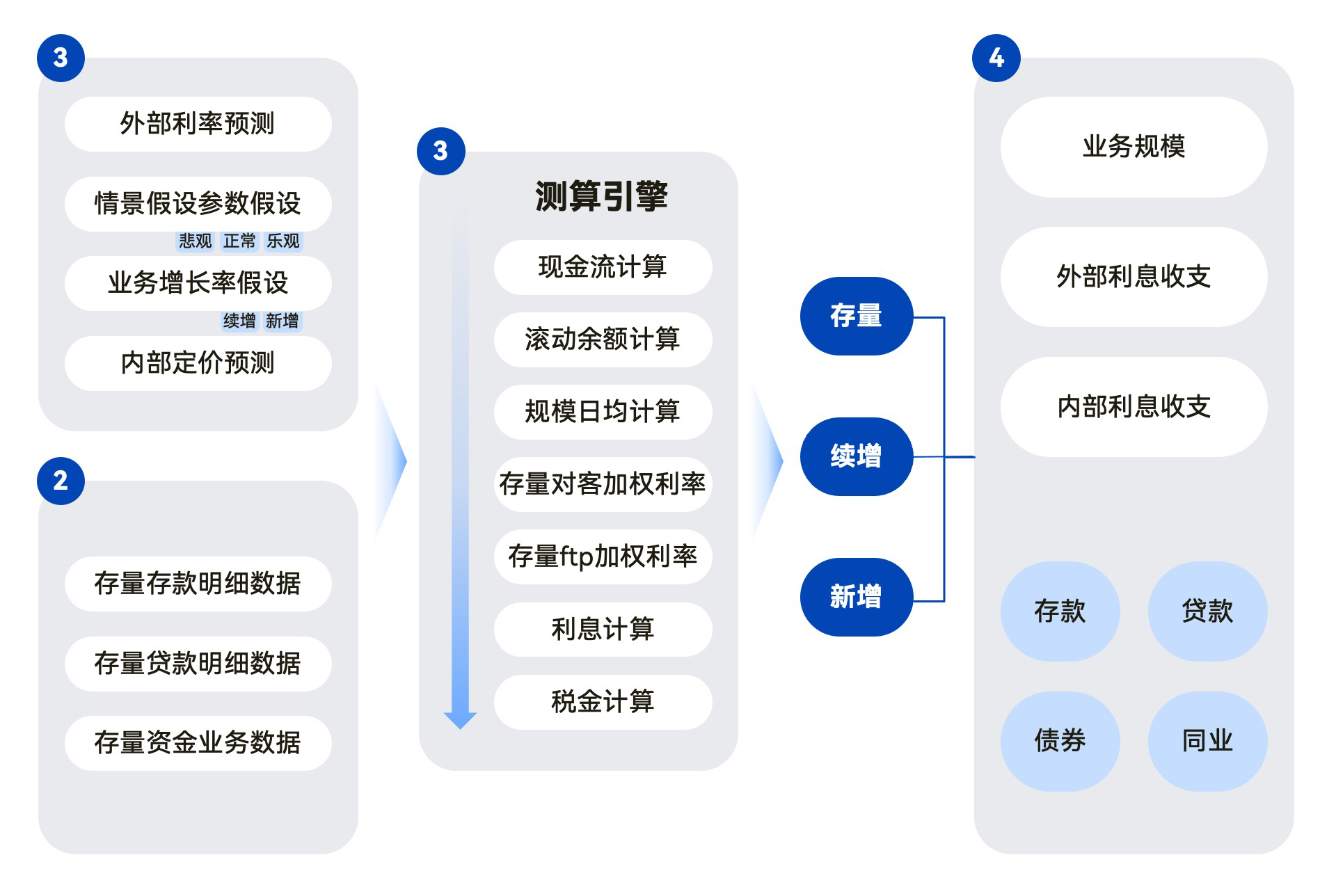 根據(jù)外部經(jīng)濟(jì)、市場(chǎng)指標(biāo)、同業(yè)信息,結(jié)合銀行發(fā)展戰(zhàn)略,對(duì)該農(nóng)商行的各業(yè)務(wù)條線進(jìn)行情景假設(shè)模擬,包括預(yù)測(cè)存貸款對(duì)客利率、FTP利率、業(yè)務(wù)發(fā)展結(jié)構(gòu)、業(yè)務(wù)發(fā)展額度等多種未來的業(yè)務(wù)場(chǎng)景,從而對(duì)業(yè)務(wù)盈利情況模擬預(yù)測(cè)。