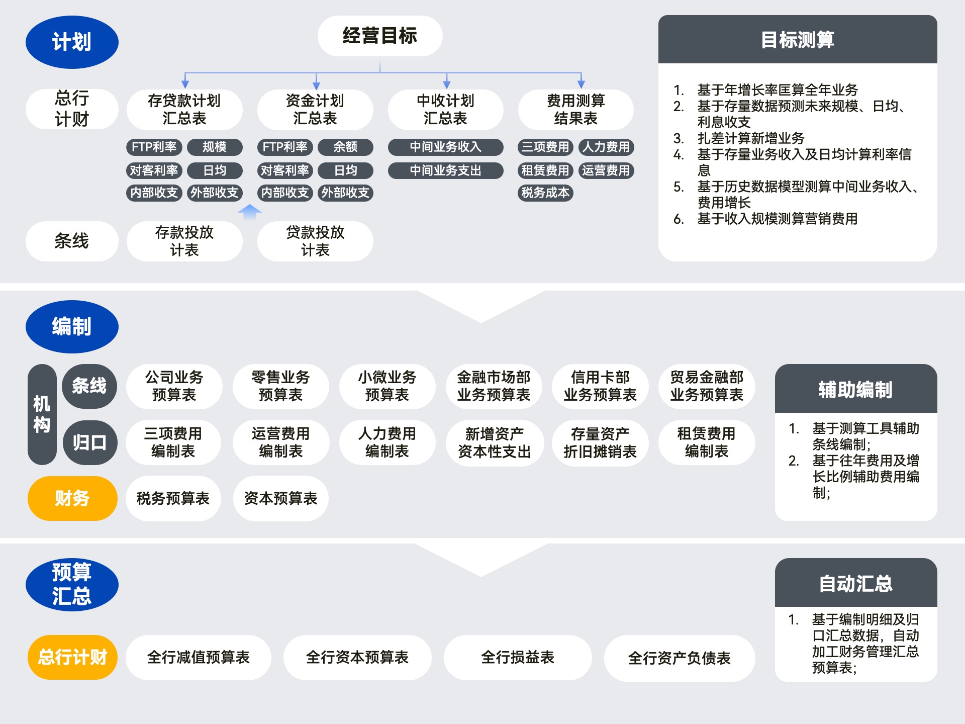 年度預(yù)算編制整體涵蓋總行預(yù)算、分支行預(yù)算、村鎮(zhèn)銀行預(yù)算的業(yè)務(wù)、費(fèi)用、財(cái)務(wù)、資本性支出預(yù)算,采用自上而下、上下結(jié)合的編制方式。