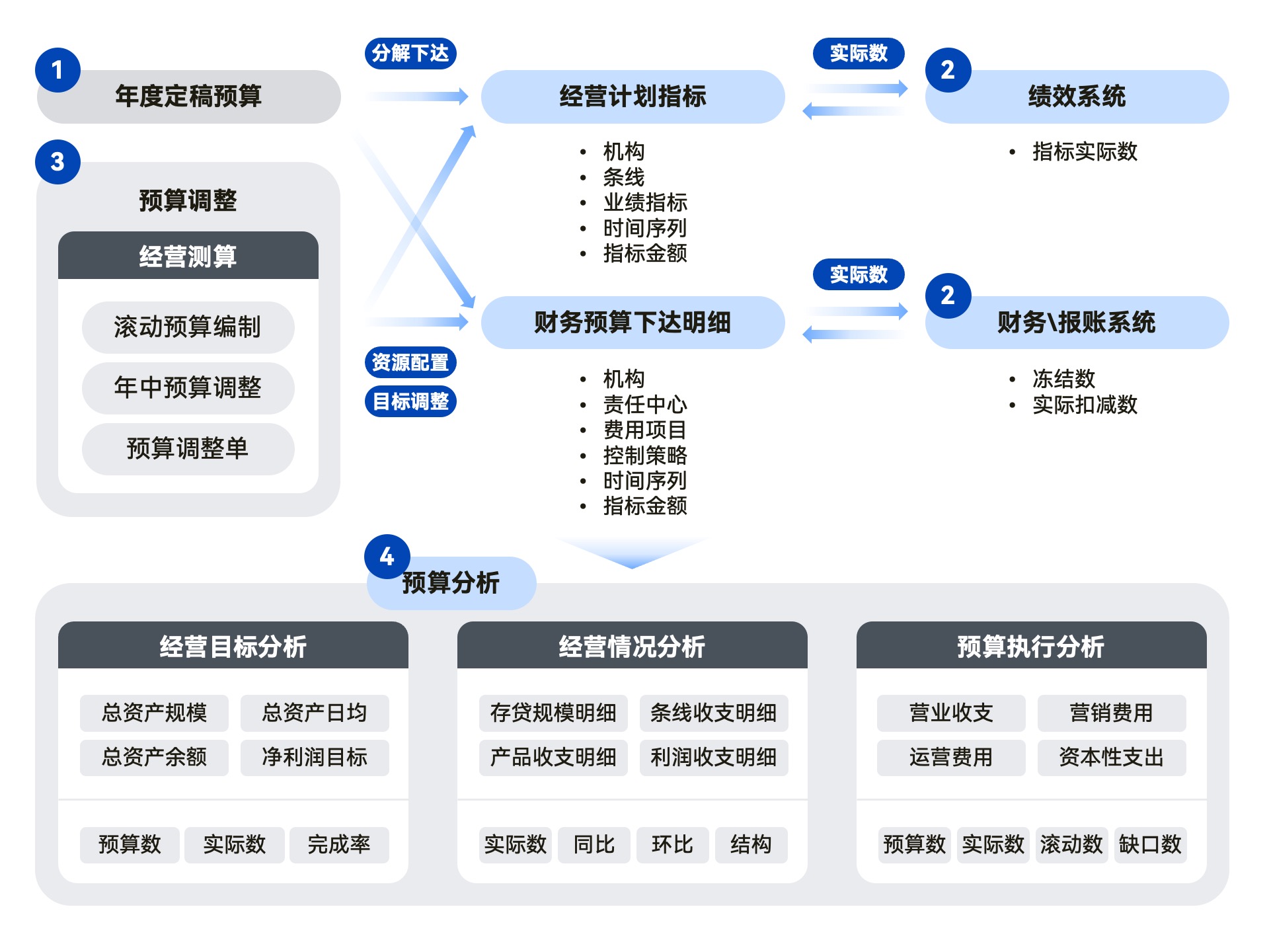該頭部農(nóng)商行,在落地了傳統(tǒng)銀行數(shù)據(jù)庫(kù)國(guó)產(chǎn)化核心系統(tǒng)后,趁熱打鐵用一年的時(shí)間、運(yùn)用分步迭代的方式進(jìn)行了全面預(yù)算系統(tǒng)的升級(jí)改造。圍繞“工具+應(yīng)用”的目標(biāo),實(shí)現(xiàn)了完整的全面預(yù)算管理、健全清晰的預(yù)算組織管理、價(jià)值導(dǎo)向的關(guān)鍵指標(biāo)體系、規(guī)范標(biāo)準(zhǔn)的預(yù)算編制模型、共享高效的信息管理系統(tǒng)等模塊的建設(shè)。