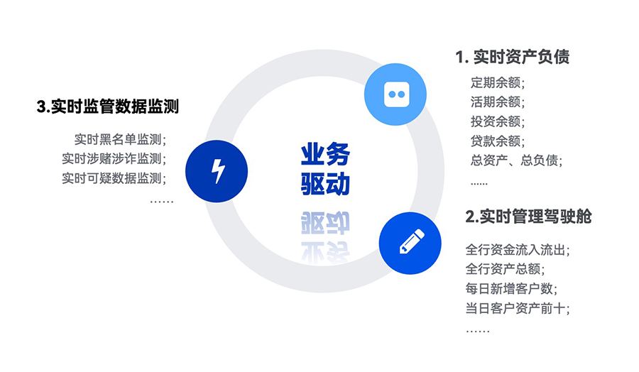 場景二:實時管理駕駛艙:通過實時獲取交易動賬,對全行級別的資金流入流出金額、客戶資產(chǎn)、申貸金額及人數(shù)等指標(biāo)進(jìn)行實時展示;