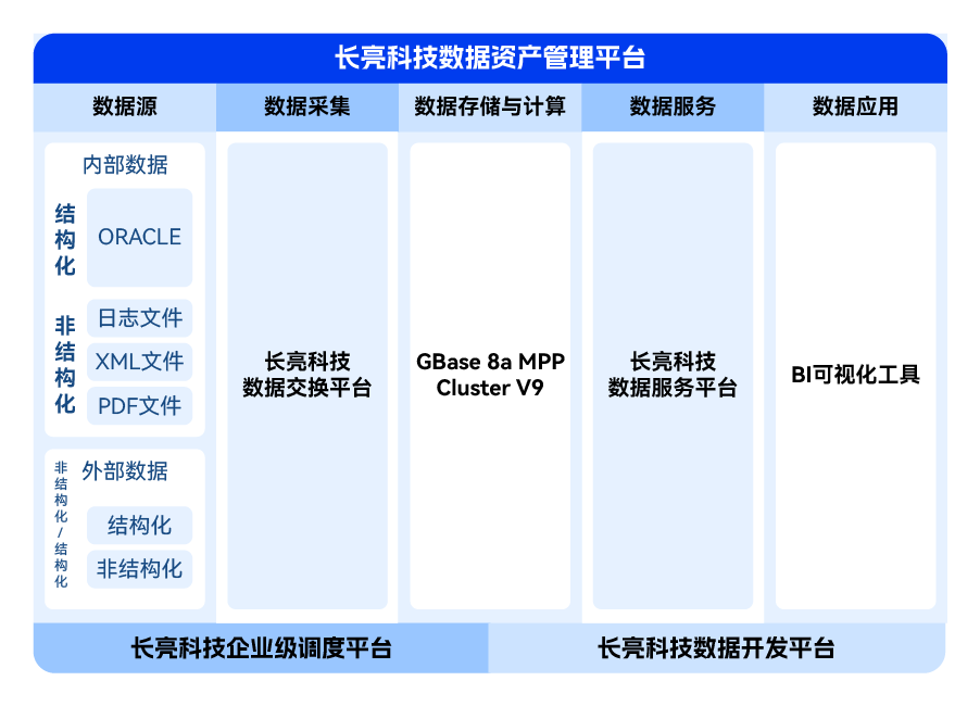能力共進,推出金融數據倉庫聯合方案 雙方早已在產品適配認證上提前布局,長亮科技數據倉庫解決方案與南大通用GBase 8a MPP Cluster V9已完成聯合測試,雙方產品完全兼容、運行穩定,充分滿足金融機構數據倉庫的建設需求。 綜合雙方在各自領域的創新優勢,該聯合解決方案以南大通用GBase 8a MPP Cluster V9為核心構件,輔以長亮科技數據開發平臺、數據交換平臺、企業級調度平臺、數據資產管理平臺、數據服務平臺,打造海量數據計算及復雜模型分析的技術平臺,實現跨業務領域數據的集中采集、存儲和共享,全面、及時、準確展現關鍵系統的運行狀況與趨勢,助力金融機構全面挖掘數據價值。 數據倉庫及其上下游系統邏輯關系圖 系統技術架構圖