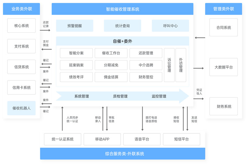 運(yùn)用先進(jìn)的動(dòng)態(tài)評(píng)分及風(fēng)險(xiǎn)定價(jià)模型、多級(jí)智能策略、大語言模型等人工智能技術(shù),以案件管控為導(dǎo)向,以提高催收效率和合規(guī)催收作業(yè)為雙目標(biāo),從金融行業(yè)不良資產(chǎn)催收處置全流程出發(fā),實(shí)現(xiàn)業(yè)務(wù)和管理的結(jié)構(gòu)化、流程化、精細(xì)化、標(biāo)準(zhǔn)化、智能化,達(dá)到防范化解經(jīng)營風(fēng)險(xiǎn)、規(guī)范業(yè)務(wù)操作、輔助管理決策、提高工作效率、促進(jìn)業(yè)務(wù)發(fā)展、降低管理成本、提高催收效益的目的。