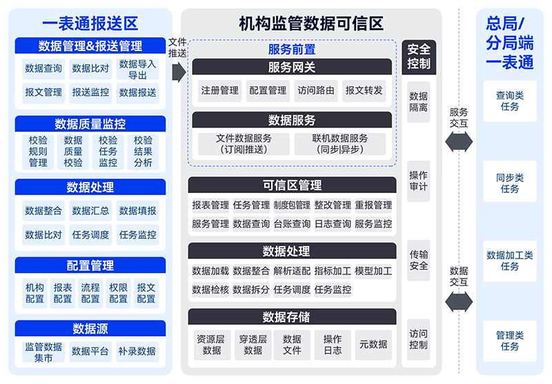 屏蔽底層技術(shù)細(xì)節(jié):通過服務(wù)前置提供標(biāo)準(zhǔn)的服務(wù)接口,打通監(jiān)管端和機(jī)構(gòu)監(jiān)管可信區(qū),從而屏蔽機(jī)構(gòu)端的底層存儲和技術(shù)差異,實(shí)現(xiàn)服務(wù)交互和數(shù)據(jù)交互。