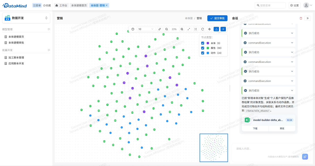 用戶可直接以自然語言描述建模目標,如“為個人客戶保險產品構建客戶-產品本體并補充產品風險相關屬性”。Model Agent自動理解需求,結合內置業務知識生成語義完整的本體模型,并以在線Excel形式返回預覽。確認后,模型一鍵生成圖形并進入審批發布流程,將建模周期從數天壓縮至分鐘級。