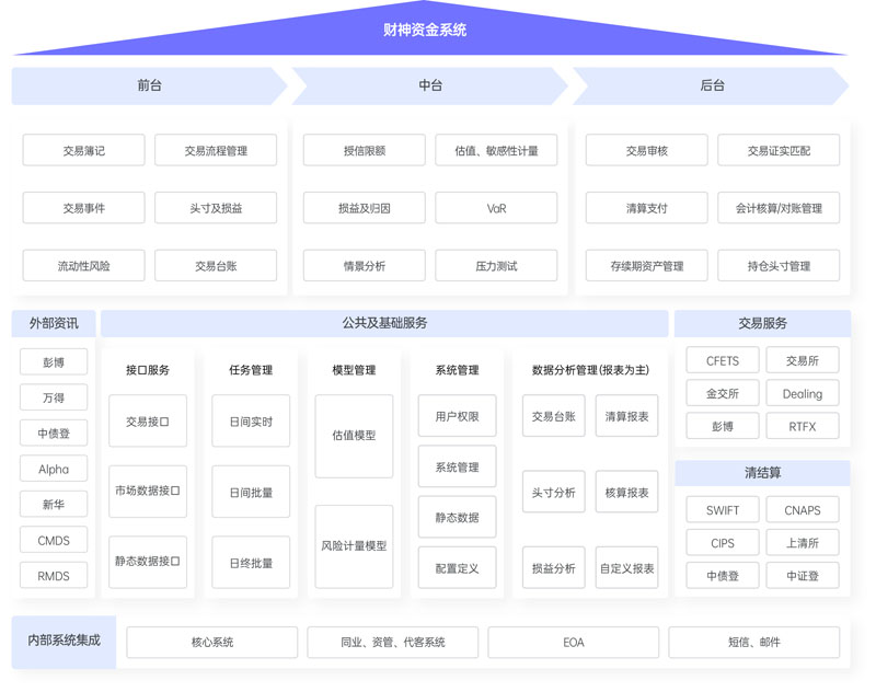 為金融機(jī)構(gòu)資金業(yè)務(wù)條線(xiàn)打造專(zhuān)業(yè)的、最大化自主可控的資金前中后一體化資產(chǎn)信息系統(tǒng),提供從前臺(tái)交易,中臺(tái)風(fēng)險(xiǎn),到后臺(tái)清算核算、報(bào)表統(tǒng)計(jì)等各項(xiàng)功能。