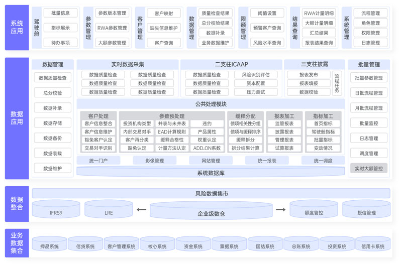 由第一支柱RWA計(jì)量系統(tǒng)、第二支柱ICAAP系統(tǒng)、第三支柱披露系統(tǒng)三大部分組成。其中,第一支柱RWA計(jì)量系統(tǒng)整合三大風(fēng)險(xiǎn)(信用風(fēng)險(xiǎn)、市場風(fēng)險(xiǎn)、操作風(fēng)險(xiǎn))加權(quán)資產(chǎn),實(shí)現(xiàn)風(fēng)險(xiǎn)加權(quán)資產(chǎn)和資本充足指標(biāo)的準(zhǔn)確計(jì)量,并實(shí)現(xiàn)資本充足率等監(jiān)管指標(biāo)的自動(dòng)計(jì)算和管理;第二支柱ICAAP系統(tǒng),構(gòu)建完備的內(nèi)部資本充足評估體系,將風(fēng)險(xiǎn)管理和資本管理緊密結(jié)合,滿足監(jiān)管合規(guī);第三支柱披露系統(tǒng),構(gòu)建完整的第三支柱披露報(bào)表管理體系,實(shí)現(xiàn)披露報(bào)表的準(zhǔn)確、合理、合規(guī)、追溯及審計(jì)要求。