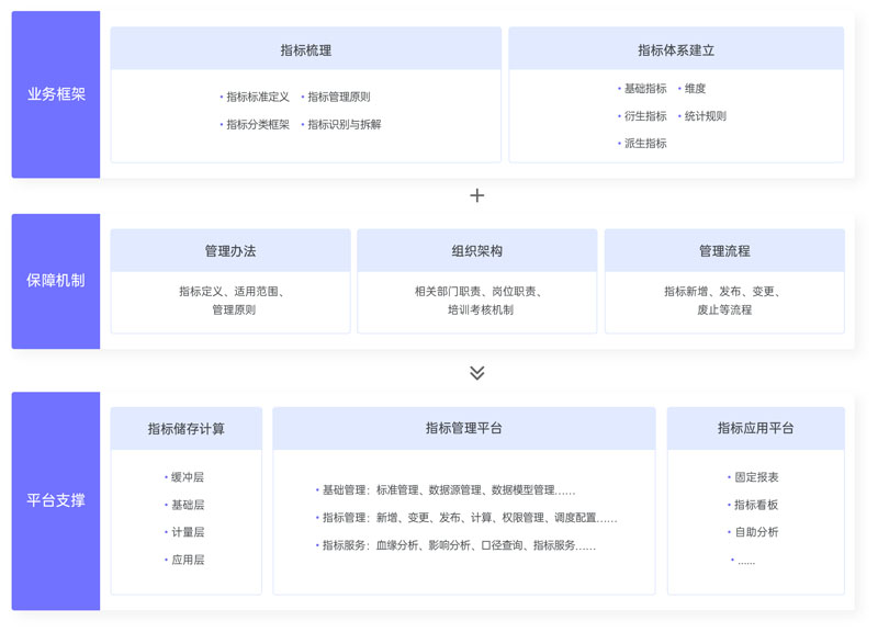 通過企業(yè)級指標(biāo)統(tǒng)一管、算,實現(xiàn)指標(biāo)全生命周期統(tǒng)一管理,包括三個方面:貼合企業(yè)現(xiàn)狀及遠景規(guī)劃,制定指標(biāo)管理機制;以業(yè)務(wù)場景為驅(qū)動,以存量指標(biāo)體系梳理為基礎(chǔ),形成企業(yè)級統(tǒng)一的指標(biāo)體系,并規(guī)劃指標(biāo)庫數(shù)據(jù)模型落地實施;搭建指標(biāo)管理平臺,實現(xiàn)指標(biāo)的統(tǒng)一定義、統(tǒng)一加工、統(tǒng)一管理、統(tǒng)一服務(wù)。