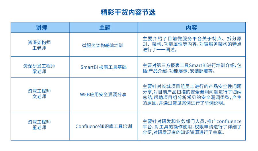 本期課程精心挑選18位專業講師,均為金融科技領域身經百戰多年的專業性人才,是名副其實的長亮科技主力軍,涉及Java開發、運維、Web、研發等工程師及架構師等。
