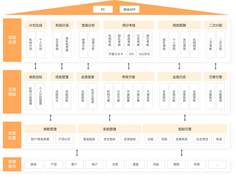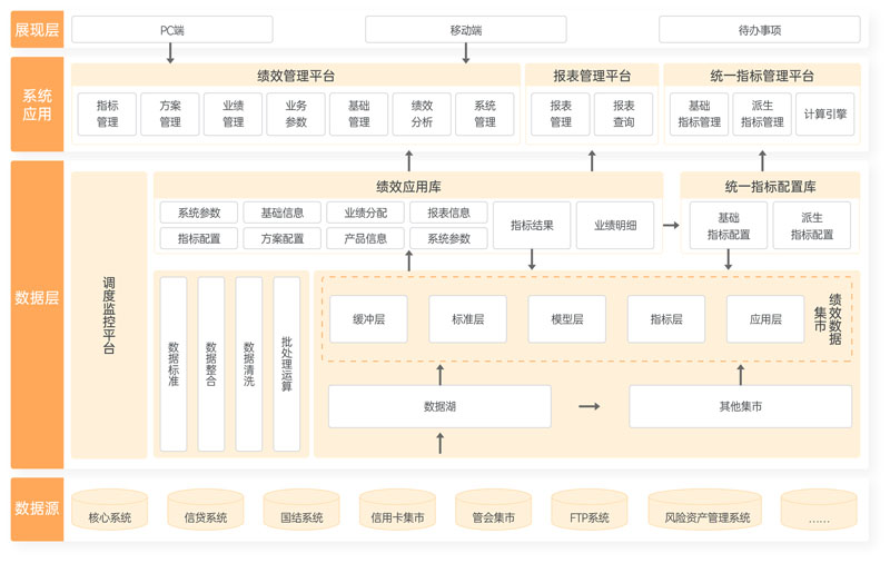 以銀行戰(zhàn)略為核心,輔助銀行實(shí)現(xiàn)價(jià)值鏈考核、精細(xì)化管理。通過全面指標(biāo)計(jì)量管理、考核靈活配置管理,實(shí)現(xiàn)全行考核覆蓋;通過業(yè)績預(yù)約、業(yè)績認(rèn)領(lǐng)、業(yè)績分配、業(yè)績轉(zhuǎn)移、業(yè)績復(fù)核、業(yè)績審批,進(jìn)行業(yè)績?nèi)鞒坦芾恚煌瑫r(shí)以業(yè)績查詢、業(yè)績排行榜、關(guān)鍵業(yè)績等業(yè)績管理模塊,刺激全行積極性;配合APP移動(dòng)端實(shí)現(xiàn)全行行為考核、移動(dòng)辦公,助力銀行維護(hù)存量客戶、促進(jìn)新客戶發(fā)展。