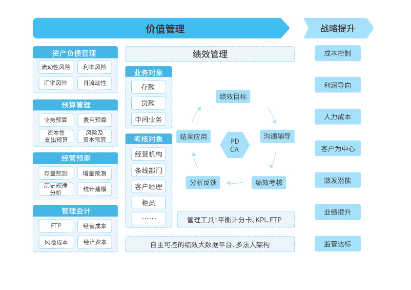 在業(yè)務(wù)架構(gòu)上,績效考核平臺深度契合到銀行整體經(jīng)營與價(jià)值管理中,通過深入結(jié)合銀行資產(chǎn)負(fù)債、預(yù)算等業(yè)務(wù)流程和管理需要,以績效大數(shù)據(jù)平臺為基礎(chǔ),經(jīng)營業(yè)績?yōu)橹攸c(diǎn),平衡計(jì)分卡、KPI等為工具,將銀行的戰(zhàn)略、資源、業(yè)務(wù)和行動有機(jī)地結(jié)合起來所構(gòu)成的一個(gè)完整的管理體系,幫助銀行實(shí)現(xiàn)對機(jī)構(gòu)、部門、柜員以及客戶經(jīng)理等全員的精細(xì)化的績效管理,實(shí)現(xiàn)全行的戰(zhàn)略落地與績效提升。