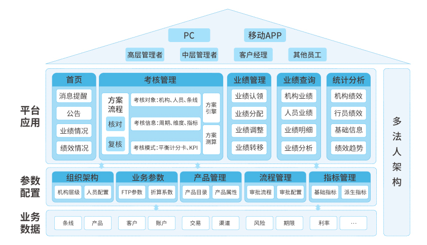 在產(chǎn)品架構(gòu)上,幫助銀行在全行統(tǒng)一考核體系框架下,實(shí)現(xiàn)各級法人、分支機(jī)構(gòu)、營業(yè)網(wǎng)點(diǎn)和人員的差異化考核,各個(gè)層級可以靈活配置考核指標(biāo)和考核方案,把績效管理思路落地到信息化系統(tǒng)。