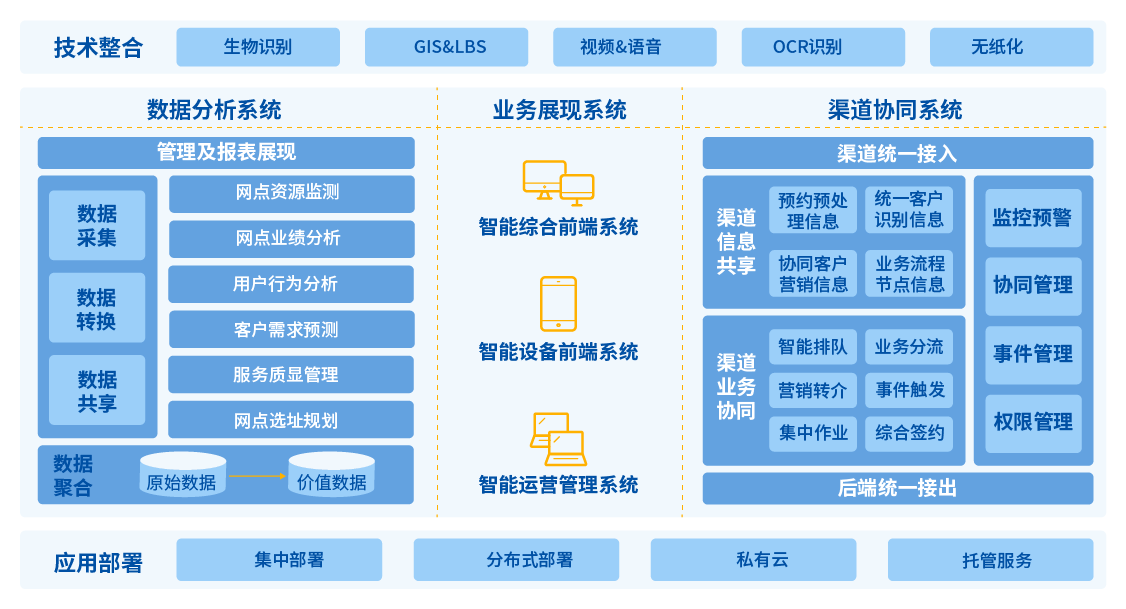 網(wǎng)點智能化服務流程離不開網(wǎng)點各系統(tǒng)的協(xié)同作業(yè)。而要實現(xiàn)多系統(tǒng)協(xié)同作業(yè),網(wǎng)點首先需要對各渠道系統(tǒng)實現(xiàn)集中接入,完成對客戶各個接觸點的統(tǒng)一數(shù)據(jù)采集、監(jiān)測及分析;并在此基礎(chǔ)上,實現(xiàn)網(wǎng)點的協(xié)同精準營銷和協(xié)同客戶服務體驗。