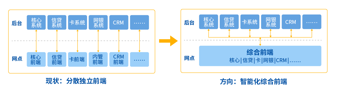傳統(tǒng)銀行網(wǎng)點存在多個業(yè)務辦理前端且相互獨立,柜員在受理業(yè)務時常常要在多個前端系統(tǒng)之間頻繁切換,極大地影響了業(yè)務辦理效率。同時,由于各系統(tǒng)IT架構(gòu)和技術(shù)體系不一致,導致了銀行運維的壓力和和成本成倍提高。因此,整合網(wǎng)點分散獨立的系統(tǒng)前端,實現(xiàn)統(tǒng)一智能化綜合前端勢在必行。