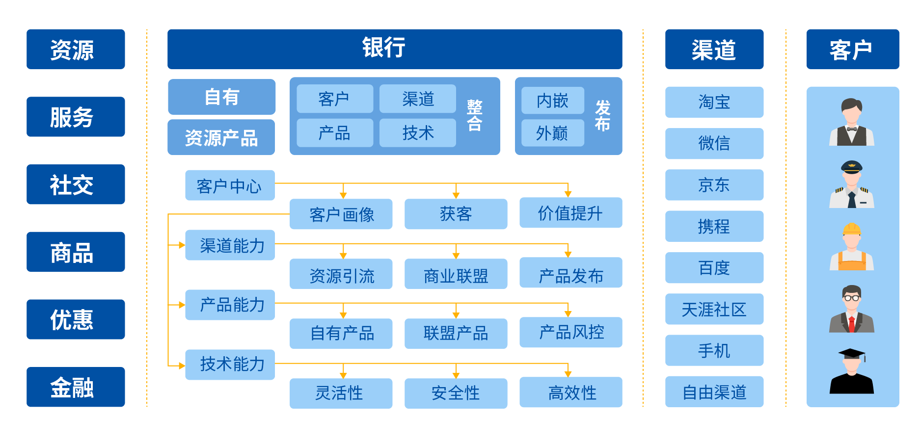 平臺(tái)通過對客戶體系、產(chǎn)品體系、渠道體系、營銷體系、風(fēng)控體系的層層解偶,解決了互聯(lián)網(wǎng)金融產(chǎn)品、客戶、渠道靈活多變的市場需求,可以配置化實(shí)現(xiàn)產(chǎn)品設(shè)計(jì)、客戶分析、渠道擴(kuò)展、營銷及風(fēng)控策略定制。