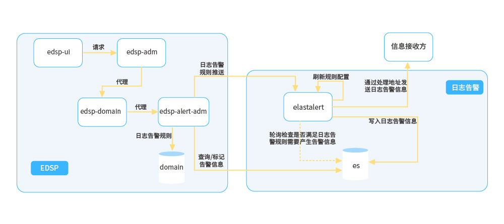 ● 日志告警:通過管控端配置告警規則提交到告警管理模塊落庫持久化,同時將告警規則推送至日志告警組件,然后刷新本地告警規則配置并定時輪詢檢測日志數據是否觸發告警規則,隨后產生相關告警事件,并將告警事件持久化,同時推送至告警推送系統進行下一步推送操作。