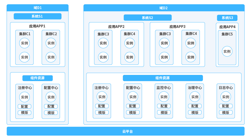 提供一套圍繞業務應用和基礎組件的管理體系。在業務應用管理方面,提供從域、系統、分區、應用和單元(集群)等多維度管理方案,進而細粒度的控制業務應用接入;在基礎組件管理方面,可以對組件資源進行統一管理,做到應用零配置化即可使用組件。